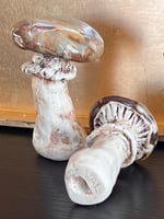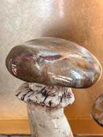 Handmade clay mushrooms by Val Garton of York, PA. These small sculptures are glazed in a painterly fashion and have a hole in the bottoms so they can go on a small bamboo skewer in your garden and stay put. Collect a grouping of different ones to have an installation.