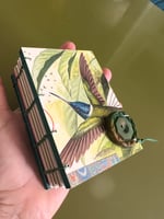 These handmade books by JoAnne Schiavone are created with up-cycled wood pieces, found images, fabric, acid-free papers and hand-painted paste papers and stitched with waxed linen thread. The binding style is the Coptic Stitch; a traditional stitch from the 5th century which allows the book to open flat.