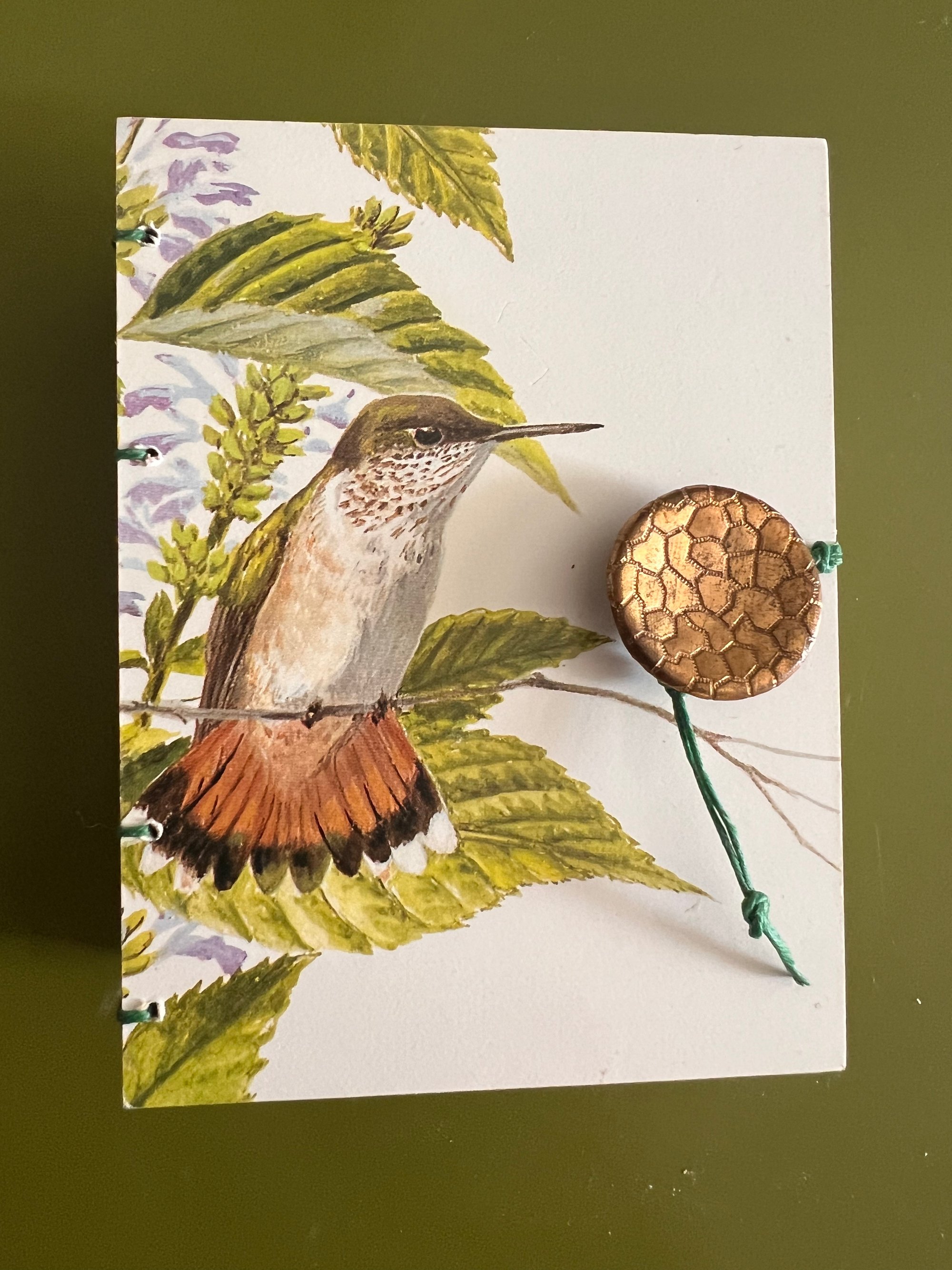 These handmade books by JoAnne Schiavone are created with up-cycled wood pieces, found images, fabric, acid-free papers and handmade papers and stitched with waxed linen thread. A vintage button and waxed linen thread keep it closed.
