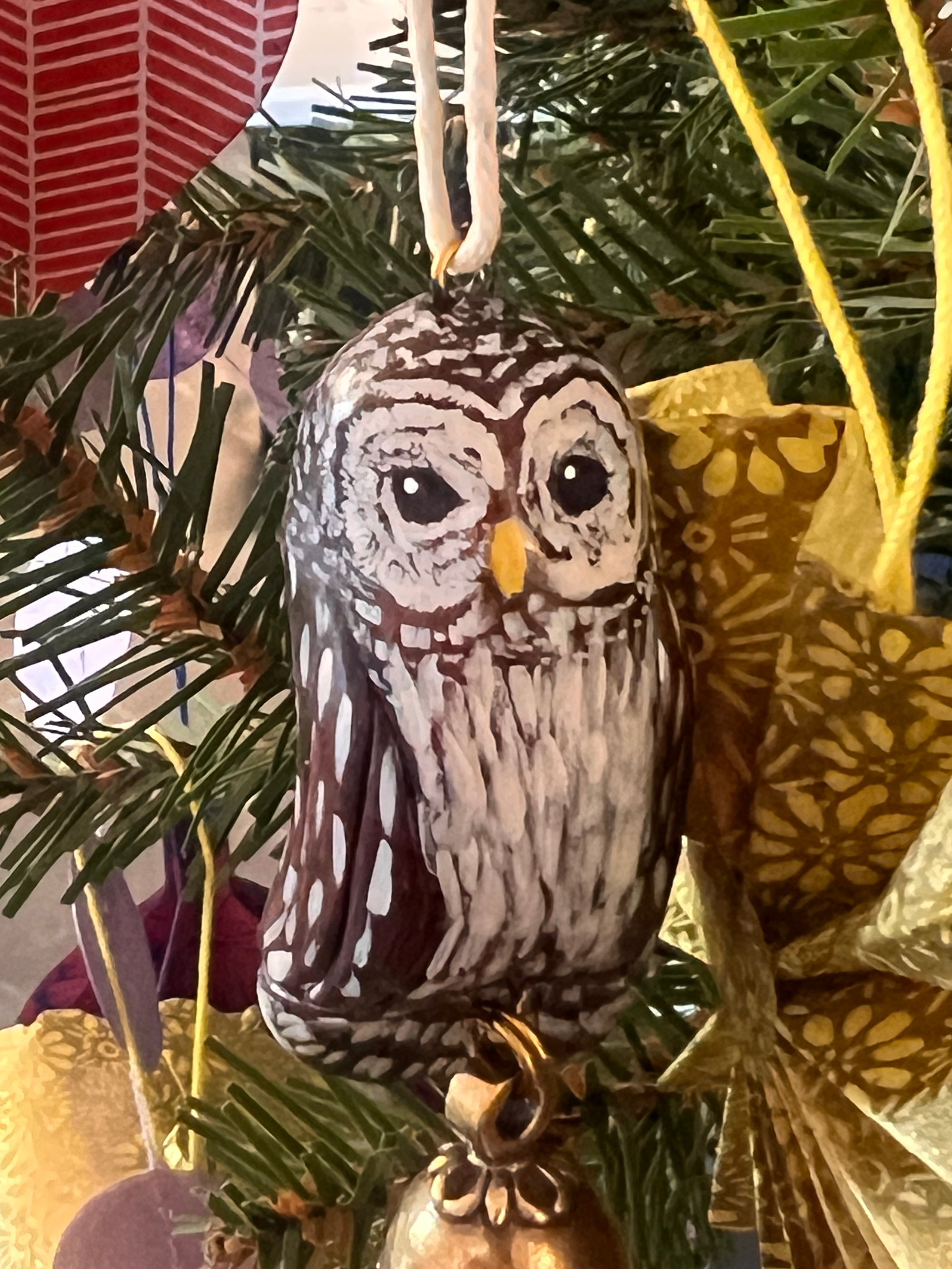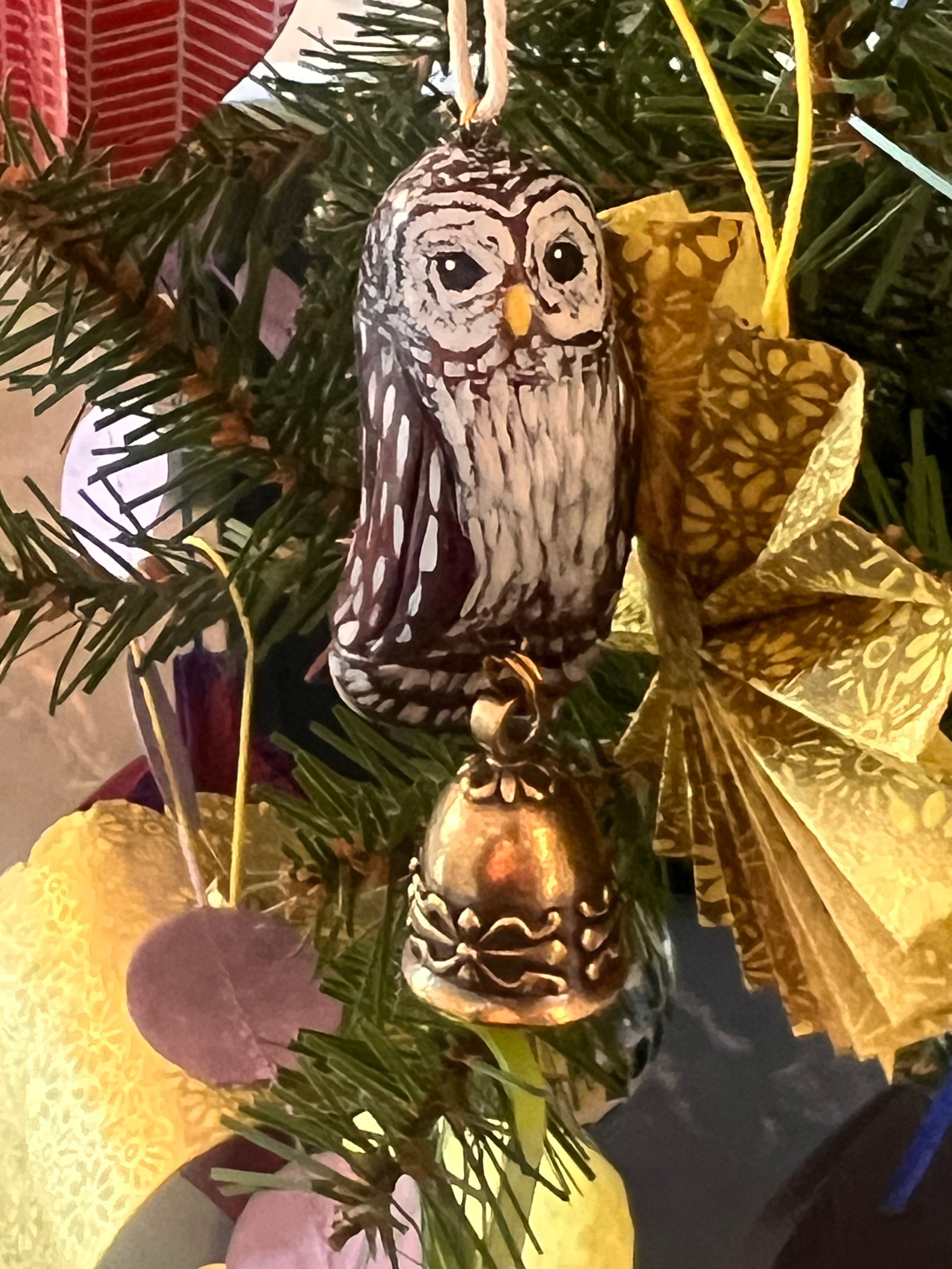 This 2/5" tall owl is hand formed by Melody Martin and then painted. Each one is unique and the bell is 1" in size. A great addition to a handmade ornament collection by artists and after it graces your tree, keep it out, hanging on a chandelier or cabinet knob somewhere in your home.